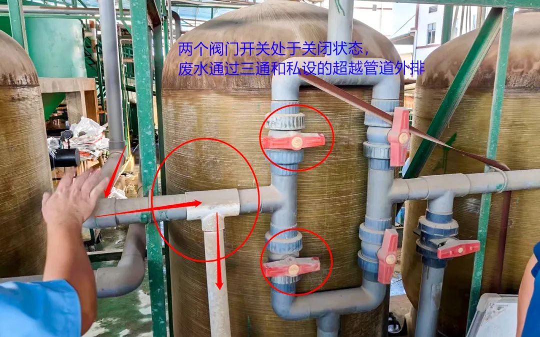執(zhí)法人員立即對(duì)該企業(yè)廢水處理設(shè)施的工藝處理情況和廢水管道的走向逐一核查,并與該企業(yè)的環(huán)評(píng)審批和驗(yàn)收資料作對(duì)比。根據(jù)環(huán)評(píng)及驗(yàn)收文件資料,該企業(yè)磨板廢水處理工藝為:磨板廢水→調(diào)節(jié)池→反應(yīng)池→沉淀池→回調(diào)池→中間水池→砂過(guò)濾器→炭過(guò)濾器→回用于磨板工序。經(jīng)檢查,執(zhí)法人員發(fā)現(xiàn)該企業(yè)擅自在磨板廢水由中間水池至砂濾、炭濾器的管道上私設(shè)三通和2個(gè)閥門開(kāi)關(guān),通過(guò)控制三通和閥門開(kāi)關(guān)使磨板廢水在不經(jīng)過(guò)砂過(guò)濾器、炭過(guò)濾器等后續(xù)處理的情況下外排。